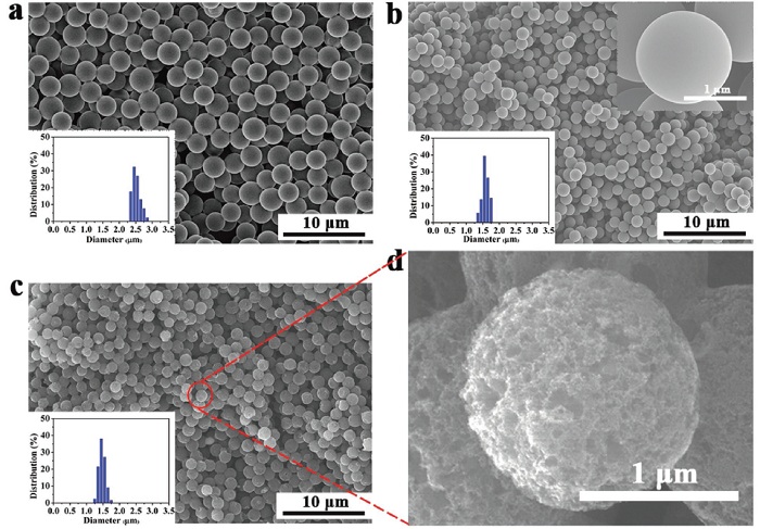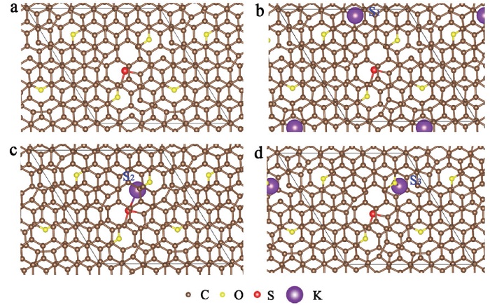 a) 多孔碳微球;钾吸附在b)S1,c)S2,d)S3位置的示意图。