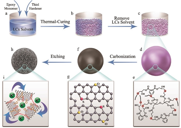 近日,来自北京大学的王前特聘研究员、郭少军研究员和杨槐教授(共同通讯作者)在著名期刊Advance Energy Materials上发表题为” Sulfur/Oxygen Codoped Porous Hard Carbon Microsphere for High-Performance Potassium-Ion Batteries”的文章。该文章报道了一种通过热解液晶/环氧树脂单体/硫醇固化剂体系形成的聚合物微球,并运用简易的碳化-刻蚀策略来制备硫氧共掺杂多孔碳微球用于高性能钾离子电池负极。无定型的多孔碳微球有着合适的插层间距(0.393nm),较大的比表面积(983.2m2 g-1),以及分层的微孔/介孔结构。该微球在50mA g-1电流密度下有226.6mAh g-1的可逆比容量(石墨的理论比容量为279mAh g-1),1A g-1电流密度下循环2000次保持108.4mAh g-1没有衰减。
