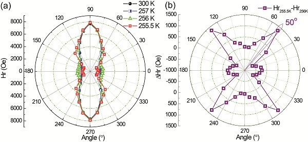 (b) 通过对5 K和256 K的共振场做差,同样在TMS临界角处获得最大偏移量。