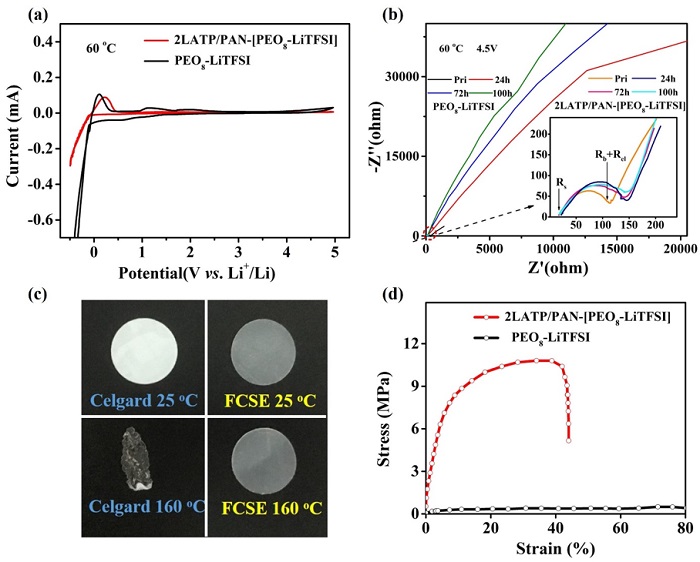 (a) FCSE和PEO-LiTFSI在60 oC测试的CV曲线
