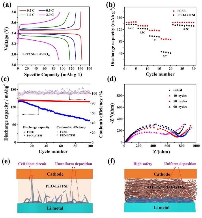 (f) Li|FCSE|LiFePO4电池锂沉积剥离示意图