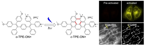 香港HTH官网地址 大学的唐本忠院士课题组报导了一种光激活的荧光探针,o-TPE-ON+,可针对细胞线粒体进行特异性成像。o-TPE-ON+本身由于分子量很强的ICT作用不发光,在光照下发生周环反应,转换成很亮的c-TPE-ON+。此探针实现了对活细胞线粒体的STORM成像,分辨率达到了纳米级别。