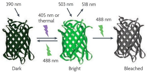 用于超分辨成像的荧光蛋白被分为三类。第一类是不可逆的光激活荧光蛋白,这类荧光蛋白的荧光可以通过特定波长的光激发,激发后不能恢复到激发前不发光的状态;第二类是光转移荧光蛋白,这类荧光蛋白的激发光谱和发射光谱可以通过光照来移动改变;第三类是光学开关荧光蛋白,这类荧光蛋白的荧光可以通过光照来实现“开和关”状态的切换。