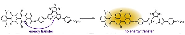 二芳烯作为一种常见的光致变色材料在数据储存和光转换方面都有广泛的用途。通过将苝单酰亚胺和二芳烯共价连接,可以克服二芳烯荧光量子产率较低的缺点。所形成的荧光探针同时具备了光转换性质和较高的荧光量子产率。当二芳烯关环时,苝单酰亚胺的发射光谱和二芳烯的吸收光谱重叠,荧光共振能量转移使苝单酰亚胺的荧光被二芳烯猝灭;当二芳烯开环时,二芳烯的吸收光谱移动,两者之间的荧光共振能量转移消失,苝单酰亚胺发光。这个光致变色的分子成功地用在了PALM成像中,分辨率高达100纳米,实现了对嵌段聚合物的微观结构的成像。