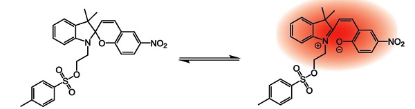 螺吡喃作为一种光致变色材料,染料本身是无色的,在紫外光照射后开环形成两性离子部花菁结构。后者在500-650纳米具有显著的吸收,发光范围在红光到近红外区间。由于螺吡喃的光学开关性质,成功用于PALM成像,并实现了对嵌段共聚物微观结构的观察。