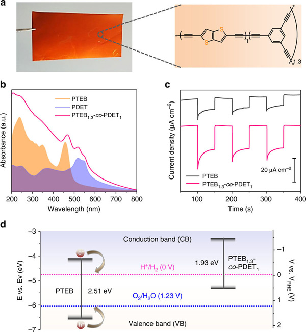 (c)c在PTEB1.3-co-PDET1(红色曲线)和原始PTEB(黑色曲线)的间歇照射下,0V vs.RHE偏压下的瞬时光电流密度与时间的关系