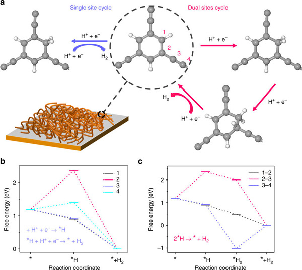 (c)通过双位点反应途径H2进化的自由能变化:位点1-2,2-3和3-4表示不同的活性位点,如a中所标记的