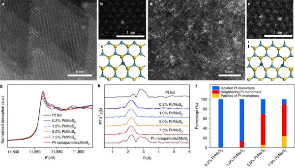 i) 基于HAADF-STEM图的直接观察,在不同Pt负载量的Pt/MoS2中孤立Pt单原子、近邻Pt单原子和小片Pt单原子的统计直方图