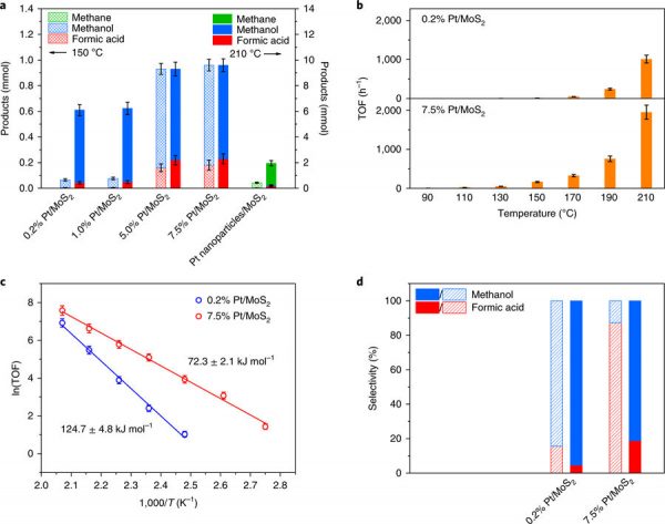 d)使用0.2%Pt/MoS2和7.5%Pt/MoS2作为催化剂且在不同比例的CO2与H2下3小时后获得的产物的选择性比较(误差线代表三次独立测量的标准偏差);
