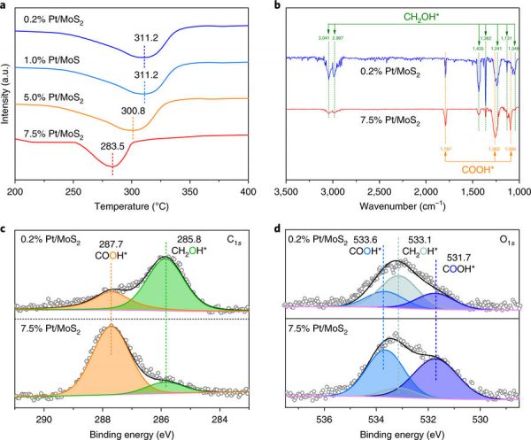 c, d) 0.2%Pt/MoS2和7.5%Pt/MoS2的C1s和O1s的原位XPS谱(在用混合气体(CO2:H2 = 1:3,1bar)在150℃下处理样品0.5小时后获得原位XPS谱);