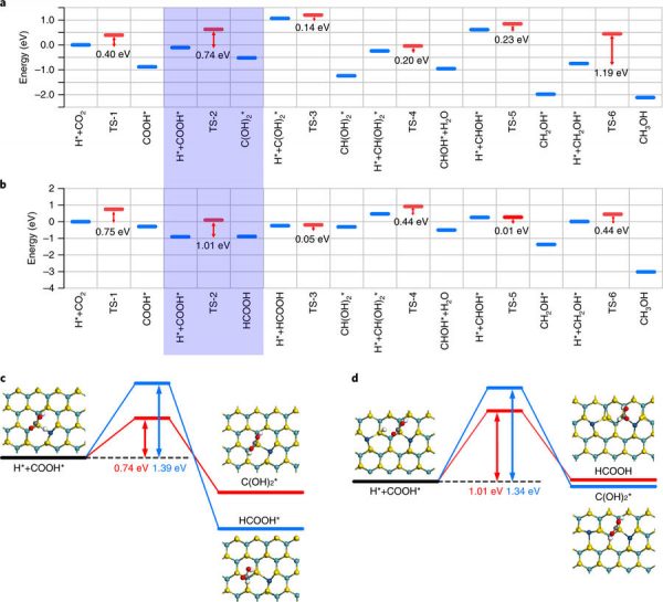 a, b) 分别针对Pt1/MoS2和Pt2iii/MoS2在CO2加氢中优化的反应路径;