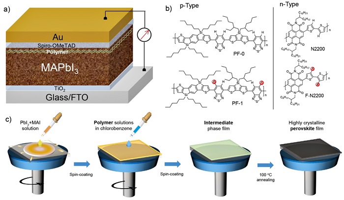 图1 a)钙钛矿太阳能电池结构示意图,b) 含氟及不含氟的P型及N型共轭聚合物分子结构式, c)聚合物辅助的反溶剂萃取法制备钙钛矿薄膜流程图
