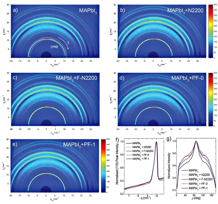 图5 二维GIWAXS 测试图,a) 纯 MAPbI3, b) MAPbI3+N2200,c) MAPbI3+F-N2200,d) MAPbI3+PF-0,e) MAPbI3+PF-1,f) 一维(110)衍射峰,g) (110)衍射峰的弧度积分统计图