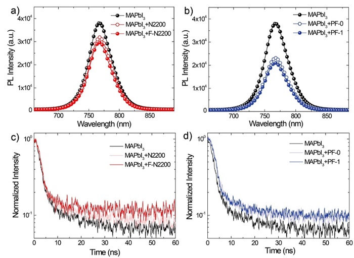 图6 含氟及不含氟的P型及N型共轭聚合物修饰钙钛矿薄膜的稳态荧光测试及瞬态荧光寿命测试图