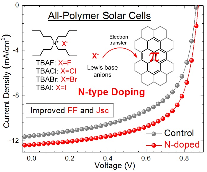 近日, 苏州大学功能纳米与软物质研究院的马万里教授团队在 ACS Applied Materials & Interfaces 上在线发表了题为 A Widely Applicable n-Type Molecular Doping for Enhanced Photovoltaic Performance of All-Polymer Solar Cells 的论文。 该论文以Lewis base anions可以和具有大π共轭的NDIs发生有效的电荷转移,提升聚合物材料载流子浓度和迁移率为设计思路,首次成功的引入一系列N型掺杂剂TBAX (X=F, Cl, Br, I)来提高以PBDB-T为给体,N2200为受体的全聚合物太阳能电池的效率。器件效率成功从5.8%提高到7.0%,其中短路电流(Jsc),尤其是填充因子(FF)都得到了显著的提高。添加相对较少的N型掺杂剂TBAX不会改变活性层形貌和相分离,但是却能很好调节受体聚合物材料的电学性质。在基于对电荷传输和复合的研究中,我们发现在聚合物薄膜中电子迁移率的提升以及缺陷态的减少是效率提升的关键。我们这项研究为提高全聚合物非富勒烯太阳能器件效率提供了一个新的策略。