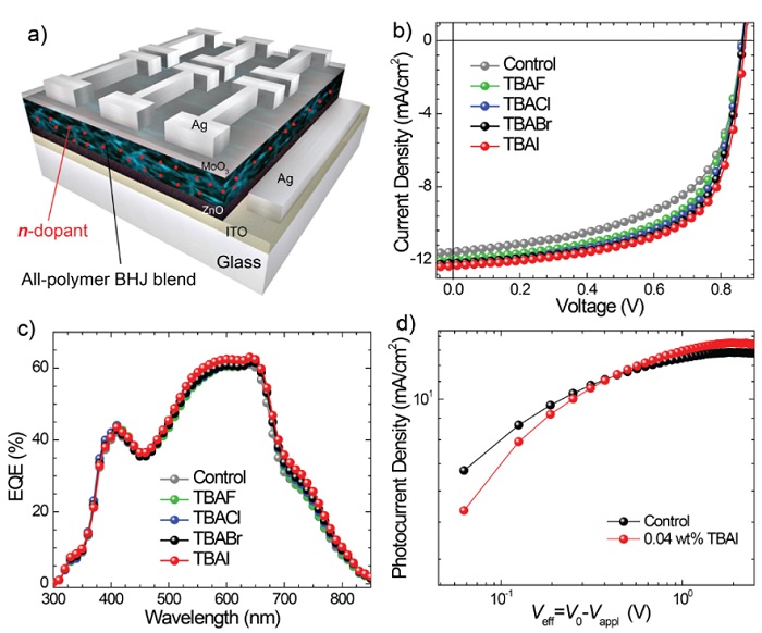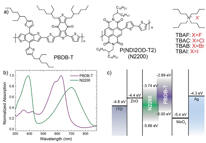 (a)给体聚合物PBDB-T, 受体聚合物 N2200以及n型掺杂剂TBAX (X=F, Cl, Br, I)的分子结构