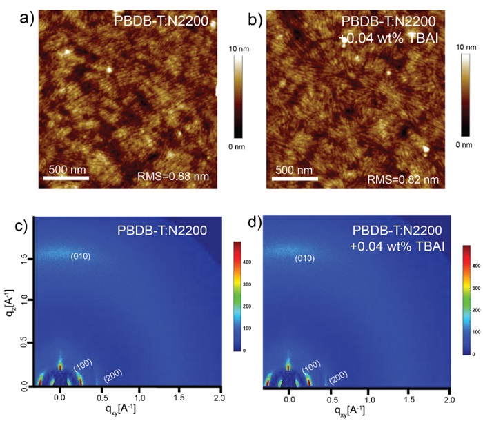 (a)和(b)掺杂和未掺杂n型掺杂剂TBAI 的PBDB-T:N2200 AFM高度形貌图