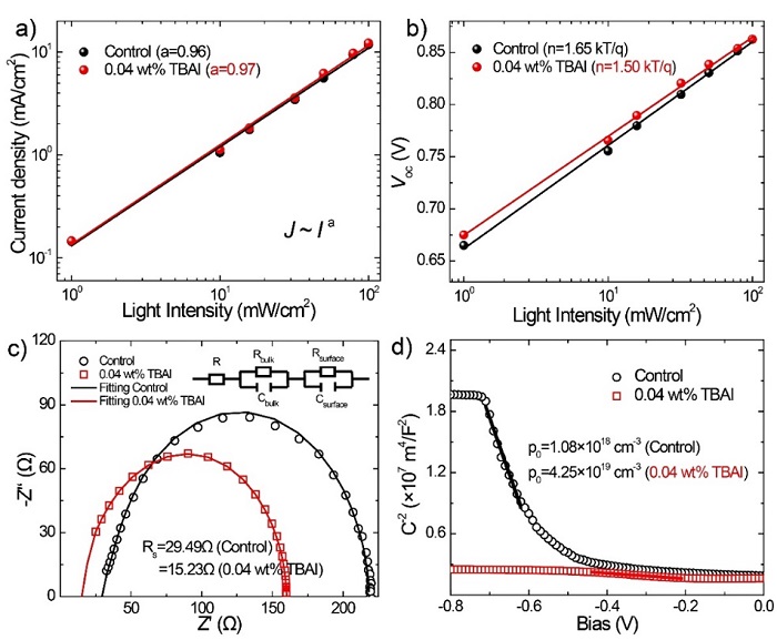(d) 添加和未添加TBAI的PBDB-T:N2200太阳能电池器件光电流密度(Jph)和有效电压(Veff)的关系