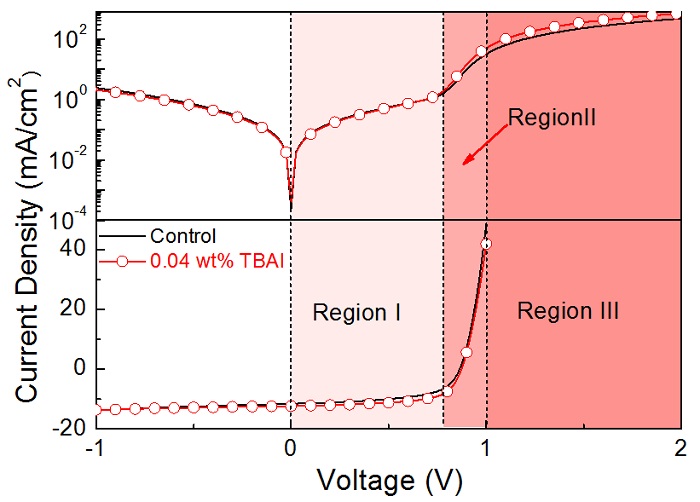 图7 上下图分别是在暗态环境下和在100 mW/cm2照射下,掺杂和未掺杂TBAI的PBDB-T:N2200太阳能电池电流密度随电压的关系