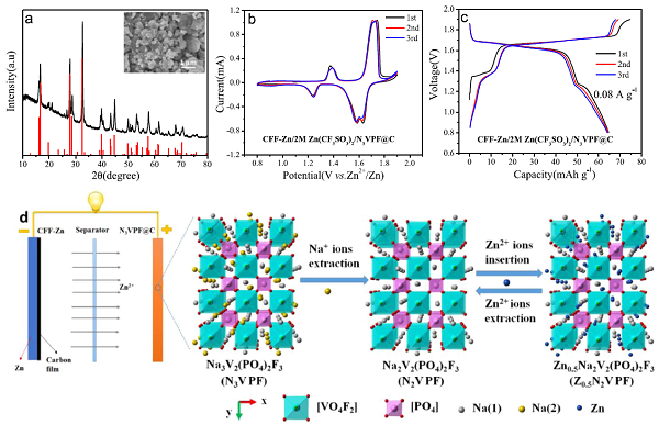 d)CFF-Zn//N3VPF@C电池结构和机理示意图;