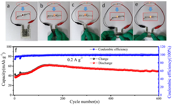 a-e) CFF-Zn//N3VPF@C软包电池的数码照片;