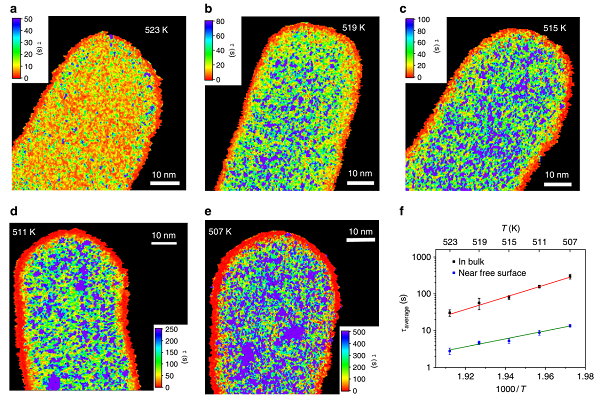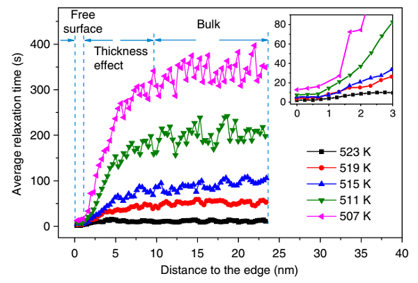 分布图显示不同弛豫时间的纳米尺度微区,随温度增加,弛豫慢的微区增大且在分布图中速战比例更多,特别是在接近Tg=507K时。接近每条纳米线表面~1nm厚的区域,弛豫时间要短20倍。