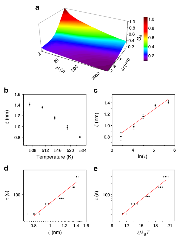 近日,美国威斯康星大学麦迪逊分校Paul M. Voyles教授在Nature Communications发表了题为“Spatially heterogeneous dynamics in a metallic glass forming liquid imaged by electron correlation microscopy”的研究论文。该团队借助亚纳米级分辨率的电子相关显微镜(electron correlation microscopy)直接实验观察到在Pt基非晶合金的过冷液态中, 动力学空间不均匀性随温度的变化情况。实验得到的四点时空关联函数显示动力学关联长度在冷却至玻璃转变点的过程中增加,且动力学关联长度随弛豫时间的函数关系与Adam-Gibbs理论、不均匀模量耦合理论和玻璃转变的随机一级相变理论都得到很好的符合。同时,实验证明纳米厚度的近表面层的存在,其比块体内部的弛豫时间要快几个数量级。