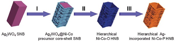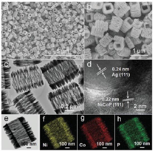研究人员首次开发了一种可将二维纳米片组装为分层的三维纳米结构的方法。模板的持续刻蚀以及磷化过程之后,中空分层的Ni–Co–P空心纳米砖(HNBs) 相比非规则的Ni–Co–P 纳米片, Ni–Co–P HNBs 是一种更高效的双功能全解水电催化剂。OER: 10 mA cm-2,过电位270mv;HER:10 mA cm-2,过电位107mv。并全在碱性溶液中展现了出色的稳定性。当将其用于全解水时,电流密度在10 mA cm-2时,电池电压仅为1.62V。