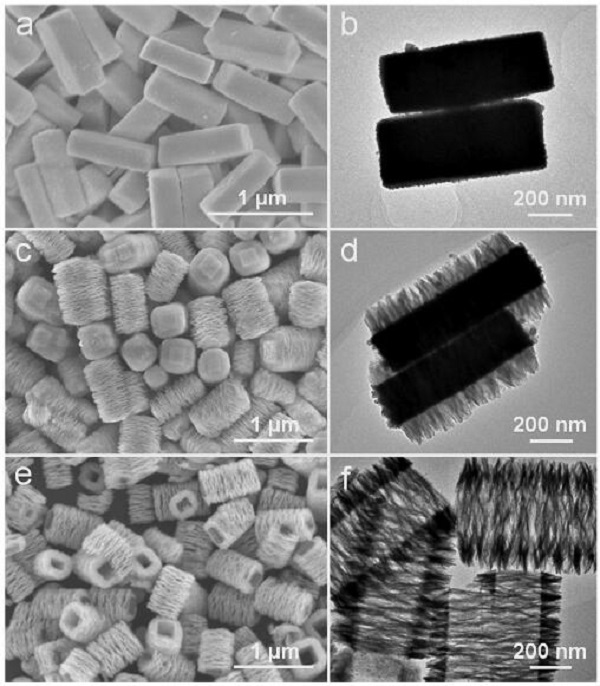 (e,f) Ni–Co–O HNBs的FESEM和相应的TEM图;