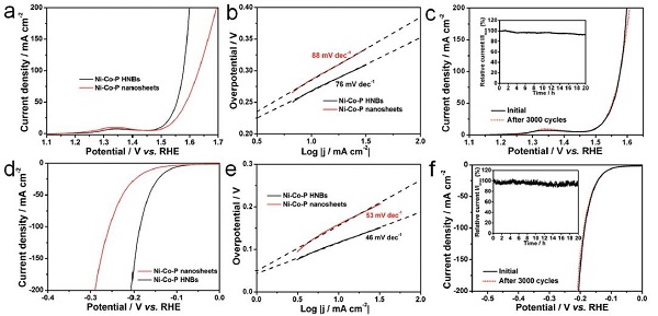 (a,d) Ni–Co–P HNBs和Ni–Co–P纳米片的极化曲线;