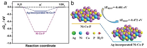 (b) Ni–Co–P和结合Ag的 Ni–Co–P的水吸附能;