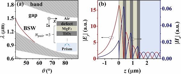 (b)1.31 μm入射波长、45°入射角下,BSW器件的电场和磁场切向分量分布,即|Ey|(红线)和|Hx|(蓝线)。