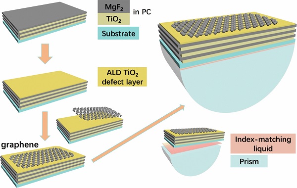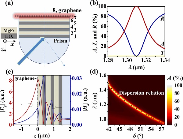 近年来,石墨烯由于其独特的物理、光电和机械优势,在光子,光电子及相关领域受到广泛关注,例如:光电转换/探测领域。然而,石墨烯的低吸收,特别是单层或少数层石墨烯,仍然是限制石墨烯基光电子系统性能的关键因素之一。单层石墨烯的吸收率仅为2.3%;对于强光照射,由于导带被填满(价带被抽空),带间跃迁被阻断,石墨烯光吸收达到饱和。因此,提高石墨烯吸收率是其广泛应用的先决条件。另外,石墨烯可激发本征表面等离子体激元(SPPs),相比于金属SPPs,其拥有更高的电磁场局域,更长的极化激元寿命以及可调谐的等离子体色散关系。基于石墨烯本征SPPs的光电探测器可以使光电流增强一个数量级。值得注意的是,针对石墨烯材料的陷光结构大部分基于复杂的纳米结构,包括超材料、由几十对介质膜层组成的微腔结构或利用纳米图案化金属体系激发SPPs。此外,金属的存在常常导致较高的寄生吸收,进一步限制了石墨烯的吸收。因此,石墨烯光电应用迫切需要结构简单且易制作的吸收增强方案,以促进其发展。