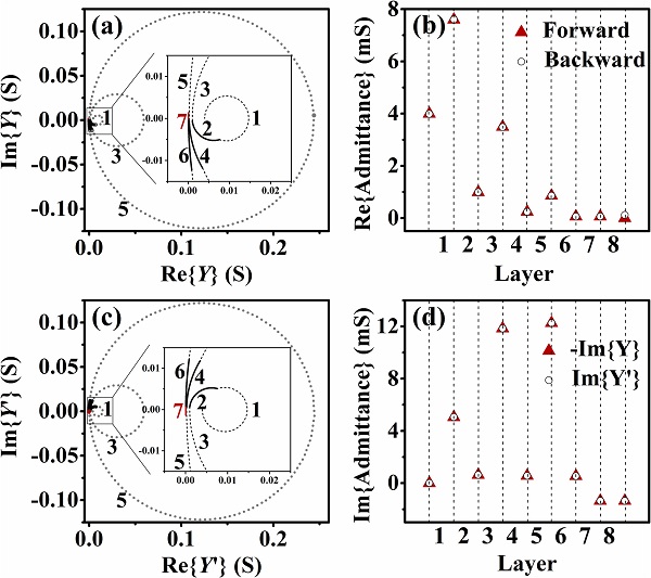 向前(a)和向后(c)光学传输矩阵法计算得到的导纳轨迹。