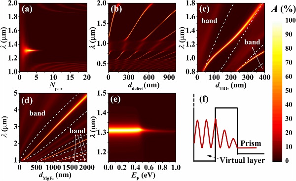 (a)光子晶体对数Npair、(b)缺陷层厚度ddefect、(c)TiO2层厚度dTiO2、(d)MgF2层厚度dMgF2和(e)石墨烯费米能级EF对吸收率的影响;(f)势垒模型示意图。