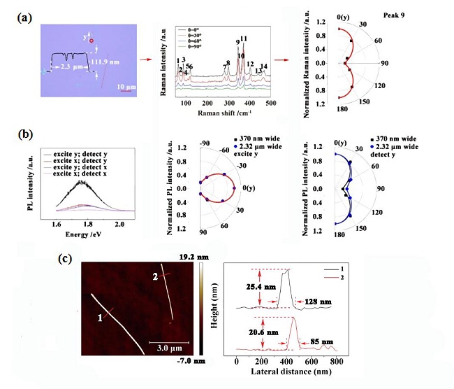 图2. (a) KP15的角分辨拉曼光谱;(b) KP15各向异性的光致发光特性;(c) 机械剥离所得准一维KP15。
