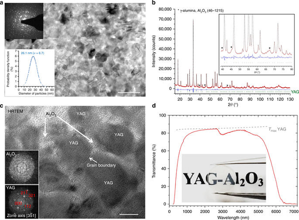 近日,中国科学院过程工程研究所李建强、法国奥尔良大学Mathieu Allix(共同通讯)等人通过Y2O3 -Al2O3大块玻璃的无压纳米结晶来简单地制造透明YAG基陶瓷。所得陶瓷呈现由YAG纳米晶体(77 wt%)组成的纳米结构,所述YAG纳米晶体由小的Al2O3结晶域(23 wt%)分开。这些YAG-Al2O3纳米陶瓷的硬度比YAG单晶高10%。 当掺杂Ce3+时,YAG-Al2O3陶瓷的量子效率为87.5%。这些机械和光学特性的结合,以及其简单,经济和创新的制备方法,可以推动技术相关材料的发展,在广泛的光学领域有潜在的应用,如透镜,宝石、磷光体转换器和激光二极管等。相关成果以题为“Pressureless glass crystallization of transparent yttrium aluminum garnet-based nanoceramics”发表在了Nat. Commun.上。