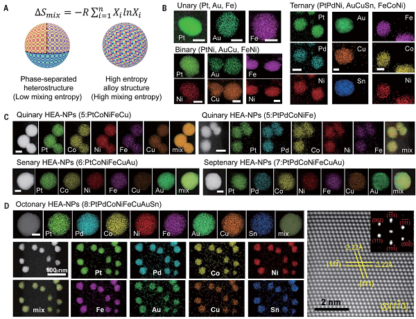 多金属纳米粒子(NMNPs)有着广泛的应用领域,包括催化,能量储存和生物/等离子体激元成像。将多种金属元素合金合成单个纳米级产品提供了可能会超过单一元素(或一元)纳米粒子材料性能的前景。制备NMNPs的当前和主要途径来自湿化学合成,可以获得各种粒度,形状和相。然而,大多数通过湿化学方法的研究报告中合金组成不超过三种元素,这限制了组成空间。此外,更多的合成技术,包括基于印刷和光刻的方法,已经将组元向四元甚至五元纳米结构转移。