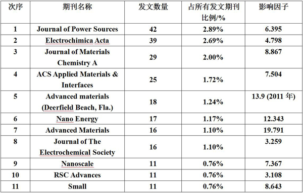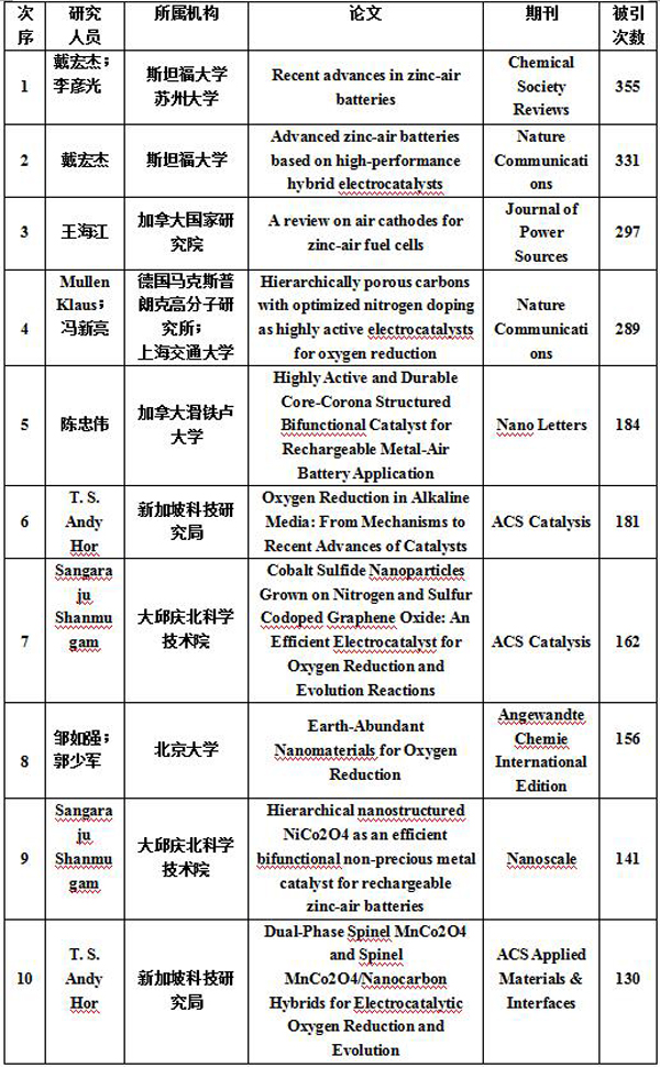 锌空气电池研究的高被引文章一共37篇,热点文章3篇,下表是高被引文章中被引次数排名前10的文章与研究人员的统计情况。