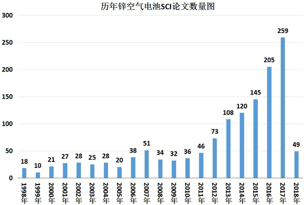 可以看出,近20年的锌空气电池的研究,随着时间的推移,每年的发文量都在逐步增加,尤其是近6年,发表的论文更是跨越式增长,并在2017年达到最高值,当年发表259篇相关论文。这说明锌空气电池的研究越来越热门,随着更多的科研人员参与研究,相关的难题将会逐渐解决。