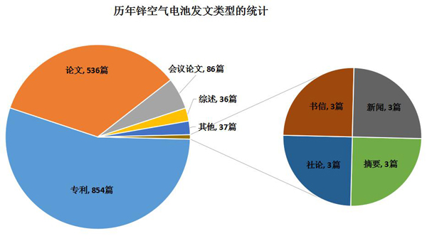 锌空气电池研究方面,历年发表的文章包括论文、专利、会议论文、综述、摘要、专著等多种形式,下图清晰地展现了历年的发文类型及各种类型的数量,其中专利和论文数量占据绝大多数。