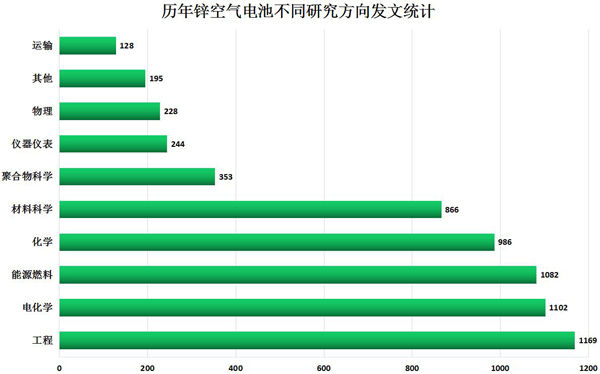 下面为历年不同研究方向论文数量统计图。从发文方向可看出,锌空气电池的研究方向百花齐放,特色鲜明。其中工程、电化学、能源燃料、化学和材料科学方向是研究的主流,论文数量占据了总数的一半以上,其他如聚合物科学、仪器仪表、物理和运输方向的研究也比较多。
