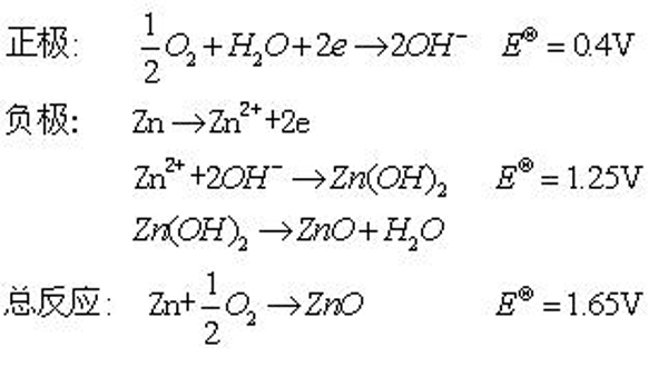 锌空气电池,是用活性炭吸附空气中的氧或纯氧作为正极活性物质,以锌为负极,以氯化铵或苛性碱溶液为电解质的一种原电池。工作原理如下: