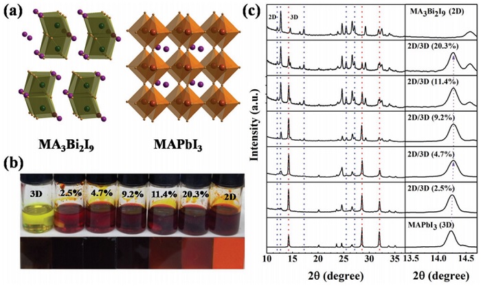 a)2D MA3Bi2I9、3D MAPbI3的晶体结构示意图。