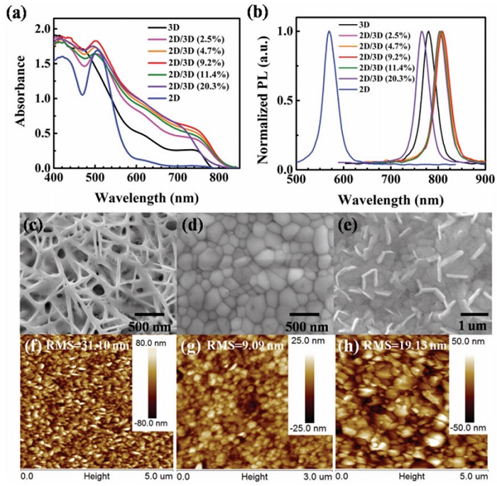 a、b)3D MAPbI3,2D MA3Bi2I9以及不同比例的2D MA3Bi2I9/3D MAPbI3异质结钙钛矿薄膜的紫外-可见吸收、PL光谱。
