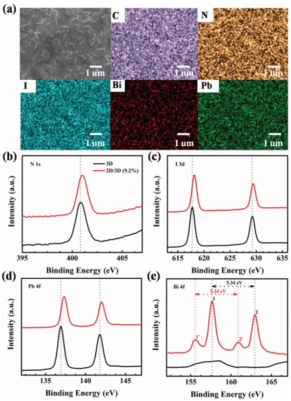 a)2D MA3Bi2I9/3D MAPbI3异质结钙钛矿薄膜的元素分布图。