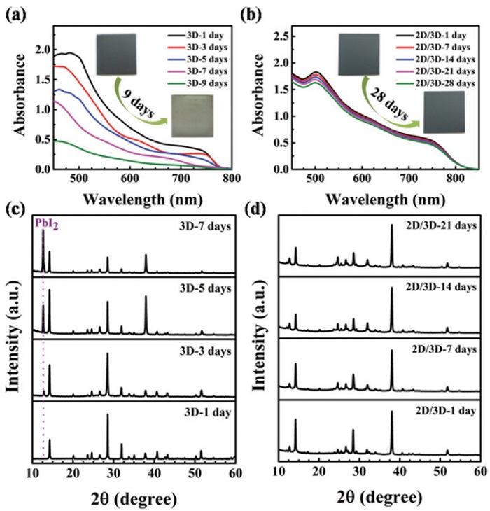 c、d)湿度稳定性测试中,不同放置时间下钙钛矿薄膜的XRD图谱变化。