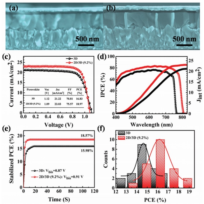 a、b)3D MAPbI3、2D MA3Bi2I9/3D MAPbI3 (9.2%)异质结钙钛矿薄膜器件的横截面SEM图像。