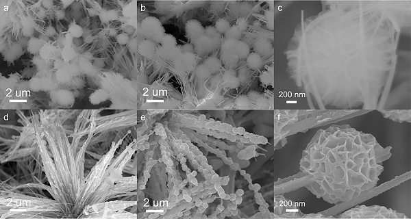 (d-f) 相反地,在电池放电后,绣球花状的放电产物均匀地包裹在Co9S8的针尖状纳米棒的外缘处,像是花蕾长在花干上,形成了较好的放电产物/电极接触界面