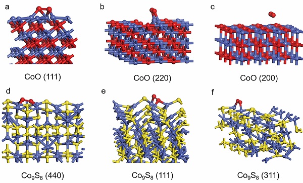 (d-f) O2在Co9S8 (440), (111)和(311)等晶面上吸附的最优化结构